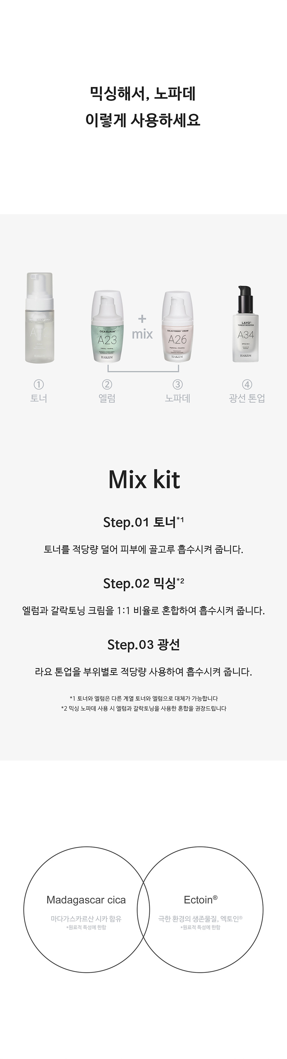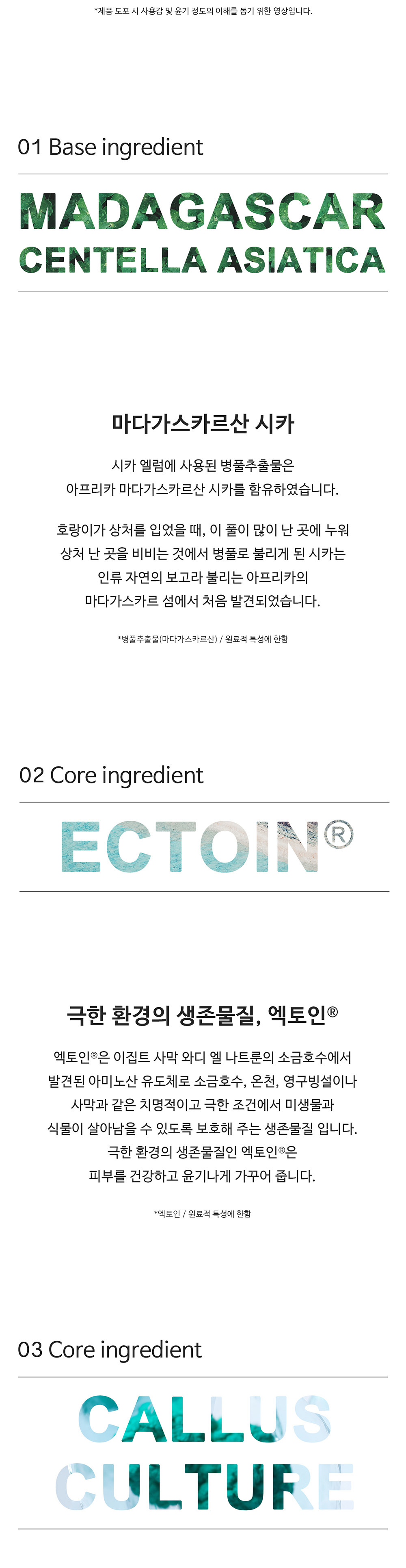 정제수, 부틸렌글라이콜, 프로판다이올, 솔비톨, 펜틸렌글라이콜, 판테놀, 1,2-헥산다이올, 폴리글리세릴-10라우레이트, 병풀추출물, 카보머, 엑토인, 글라이코실트레할로오스, 알지닌, 하이드로제네이티드스타치하이드롤리세이트, 소듐폴리아크릴로일다이메틸타우레이트, 유향나무오일, 카프릴하이드록사믹애씨드, 말라카이트추출물, 에델바이스캘러스배양추출물, 멘톨, 에틸헥실글리세린, 카프릴릴글라이콜, 폴리글루타믹애씨드, 멘틸락테이트, 시트릭애씨드, 밤부사 불가리스잎추출물, 지치뿌리추출물, 고삼추출물, 녹두추출물, 콥티스뿌리추출물, 리모넨, 글루코닉애씨드, 다이소듐이디티에이, 마데카소사이드, 마데카식애씨드, 아시아티코사이드, 아시아틱애씨드