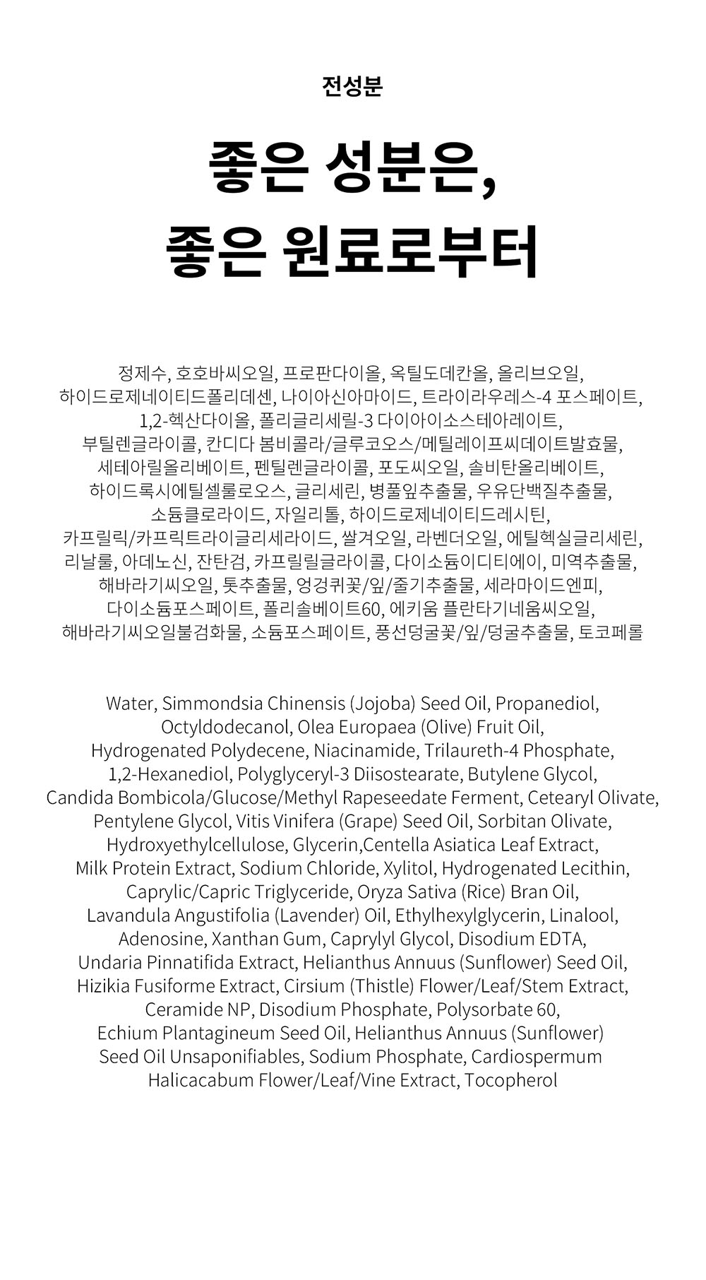 정제수, 호호바씨오일, 프로판다이올, 옥틸도데칸올, 올리브오일, 하이드로제네이티드폴리데센, 나이아신아마이드, 트라이라우레스-4 포스페이트, 1,2-헥산다이올, 폴리글리세릴-3 다이아이소스테아레이트, 부틸렌글라이콜, 칸디다 봄비콜라/글루코오스/메틸레이프씨데이트발효물, 세테아릴올리베이트, 펜틸렌글라이콜, 포도씨오일, 솔비탄올리베이트, 하이드록시에틸셀룰로오스, 글리세린, 병풀잎추출물, 우유단백질추출물, 소듐클로라이드, 자일리톨, 하이드로제네이티드레시틴, 카프릴릭/카프릭트라이글리세라이드, 쌀겨오일, 라벤더오일, 에틸헥실글리세린, 리날룰, 아데노신, 잔탄검, 카프릴릴글라이콜, 다이소듐이디티에이, 미역추출물, 해바라기씨오일, 톳추출물, 엉겅퀴꽃/잎/줄기추출물, 세라마이드엔피, 다이소듐포스페이트, 폴리솔베이트60, 에키움 플란타기네움씨오일, 해바라기씨오일불검화물, 소듐포스페이트, 풍선덩굴꽃/잎/덩굴추출물, 토코페롤